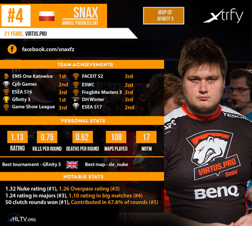 Wczeniej informowalimy o tym, e Pawe „ byali” Bieliski zosta 13 zawodnikiem minionego roku w rankingu HLTV. Wczoraj poznalimy gracza, ktry zaj czwarte miejsce, tu za podium, a zosta nim Janusz „ Snax” Pogorzelski. To naprawd wysokie miejsce dla zawodnika Virtus.pro, cho co niektrzy spodziewali si go w TOP3. Ale nie ma co narzeka, gdy Polak wyprzedzi midzy innymi takich graczy jak Jesper " JW" Wecksell z fnatic czy Kenny " kennyS" Schrub z Titan. By to naprawd wietny rok w wykonaniu Janusza, ktry a w 6 turniejach, w ktrych brao udzia Virtus.pro, by najwiksz podpor zespou. Jego najgorszym turniejem by Game Show Finals w Moskwie, gdzie jedyny raz zszed z ratingiem poniej 1.00.